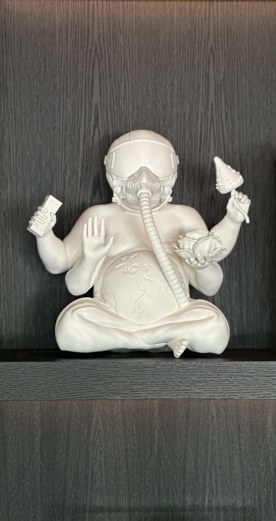 - In his left hand, he cradles a mushroom, embodying enjoyment and the simple pleasures of life.